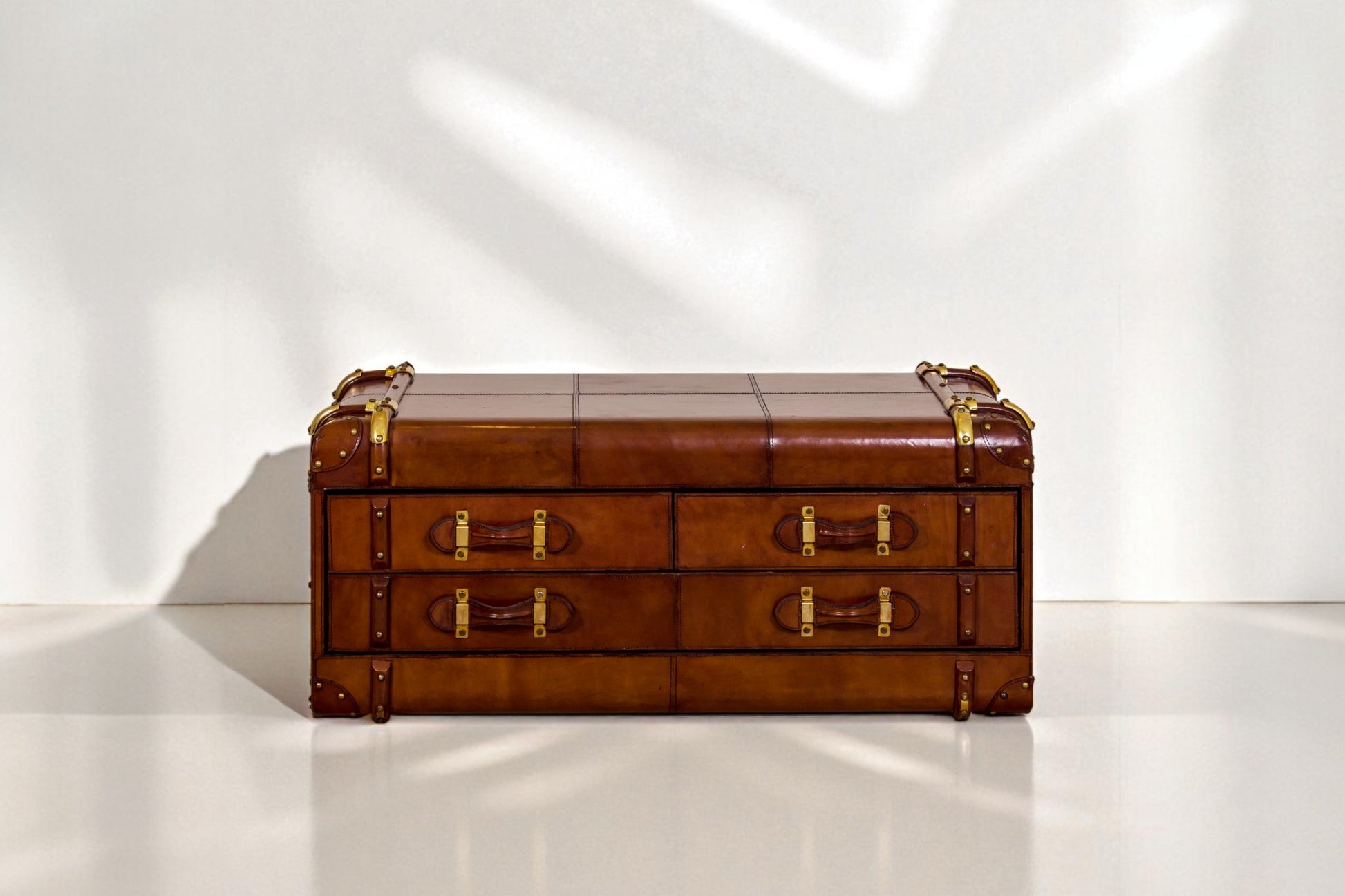 Coffee table in distressed cognac leather in a vintage look with brass hardware and wooden slats. It comes with 6 drawers with leather handles, in trunk design.