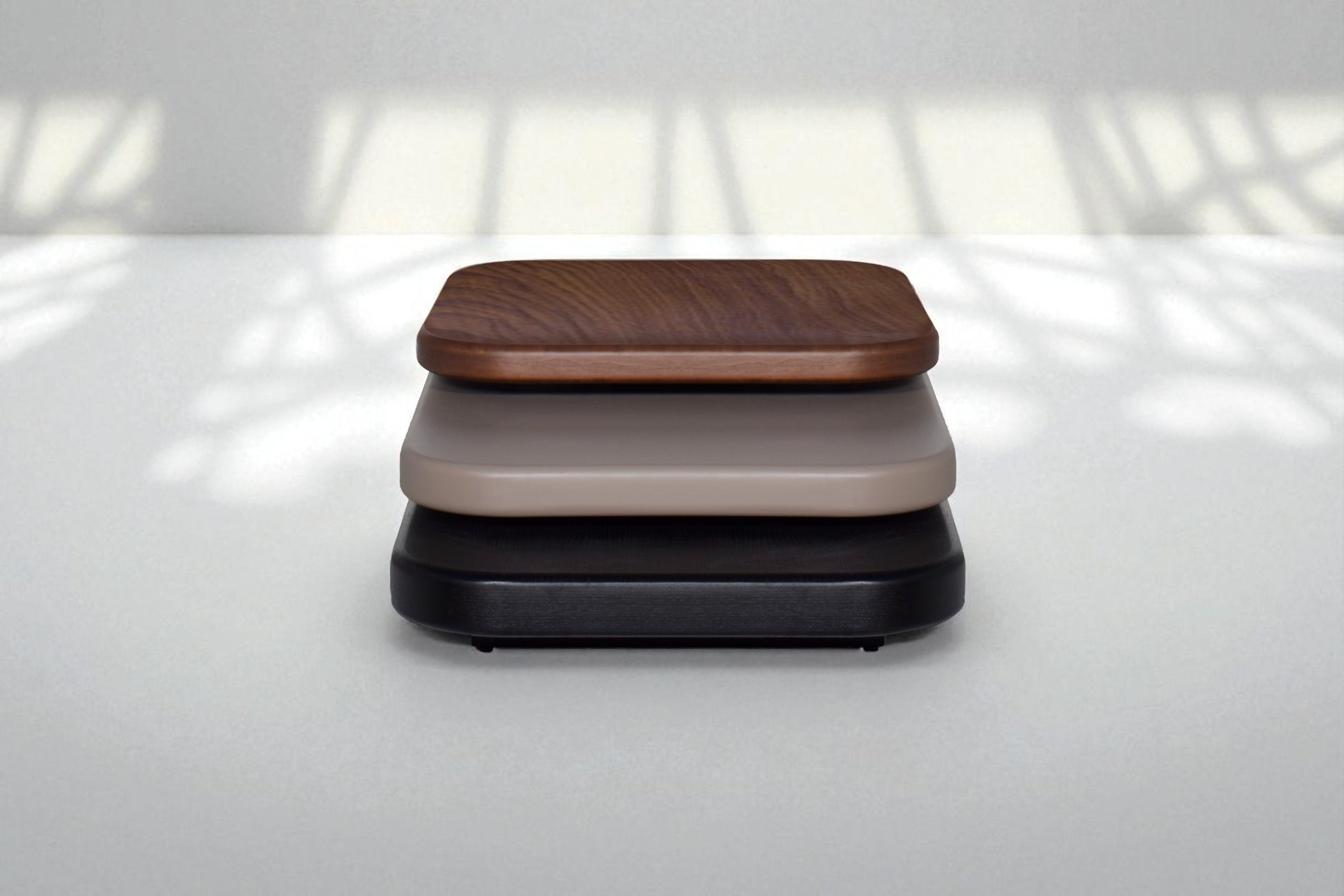 This elegant coffee table features a revolving top in sophisticated design, combining a rich walnut finish with a sleek grey and black color palette in chic modern design.