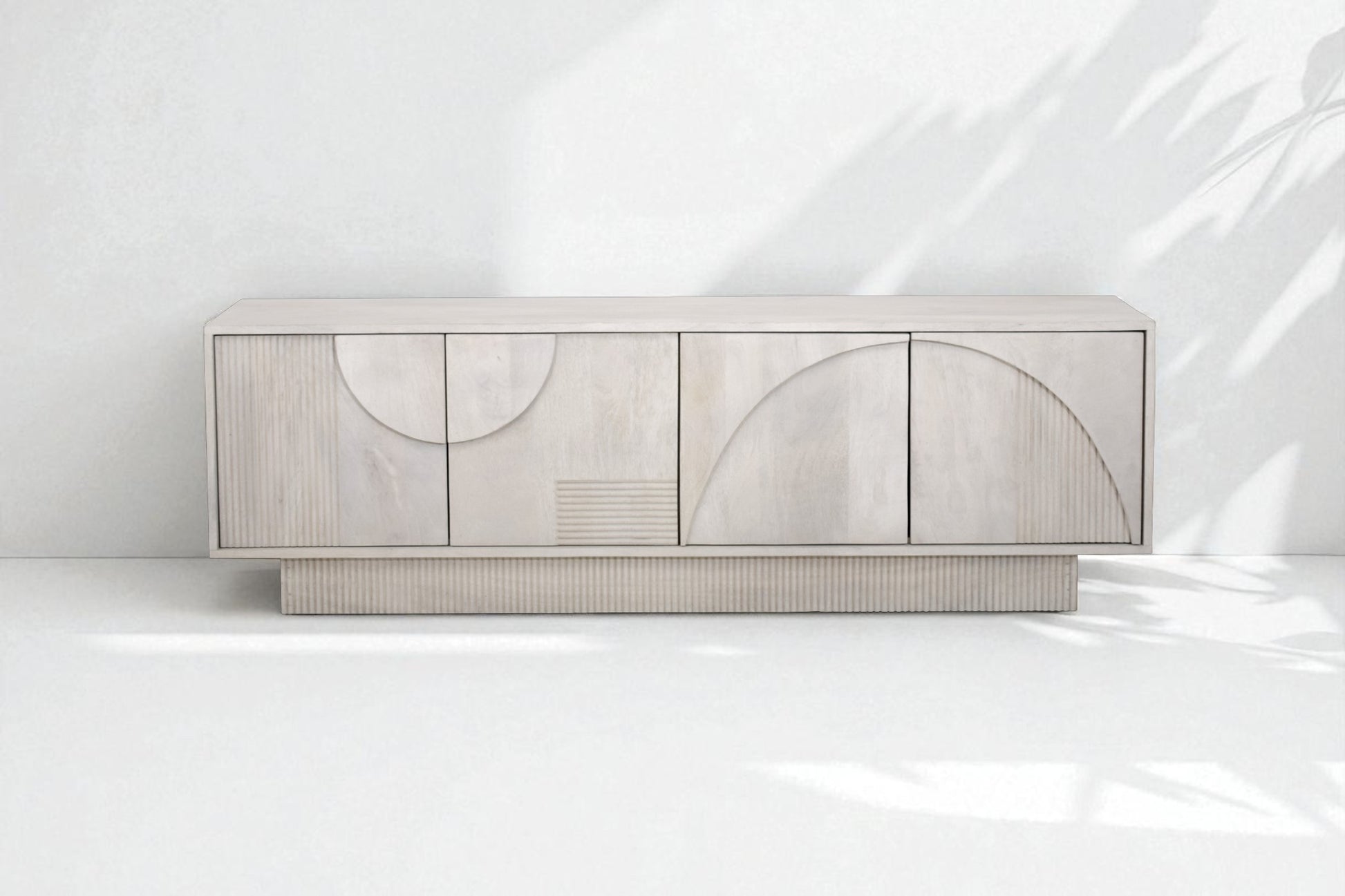 This TV unit is made from solid mango wood in a whitewashed finish. Its signature 3D geometric front delivers standout style, perfect for modern and contemporary interiors.