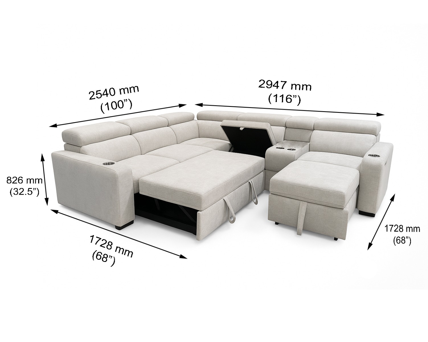 Elegantly designed left & right-aligned 2-seater + chaise with single seater and console, fully upholstered in premium fabric with adjustable headrest. Features an easy pull-out sofa bed, built-in storage, and a tech-friendly console with phone charger. Wide armrests include 4 built-in glass holders for added convenience and style.